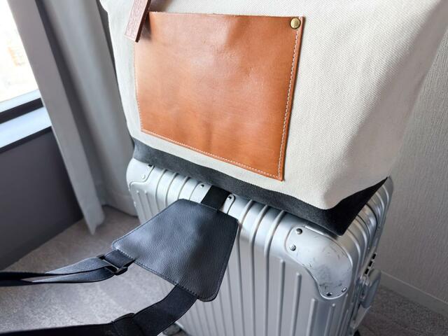 先日も旅行で使用したのですが、中央部分に合皮素材の大きなパッチがあるおかげで大きな荷物を乗せてもしっかりとホールドしてくれます。