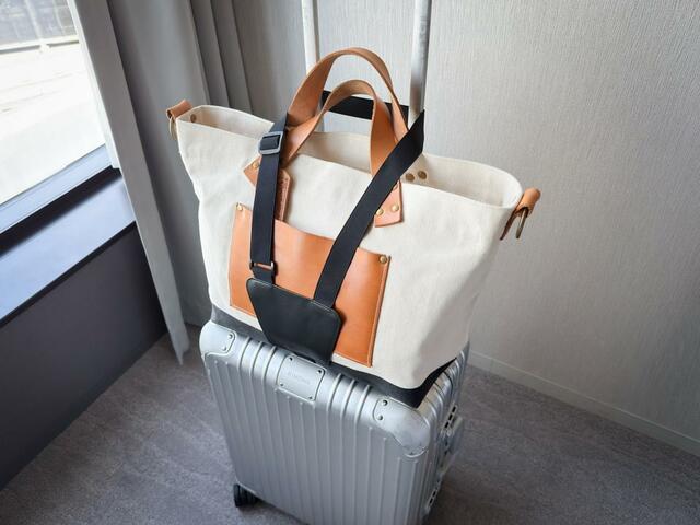 次にキャリーケースの上に載せたい荷物をセットし、あとはベルトで荷物を包み込むように回してから、もう一方の端についているゴムの輪をキャリーバーに引っ掛けるだけ。