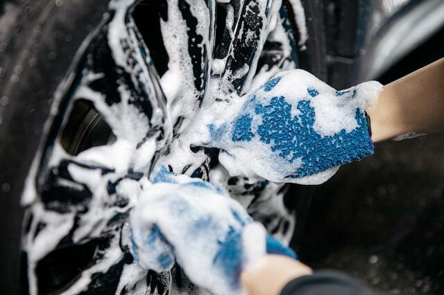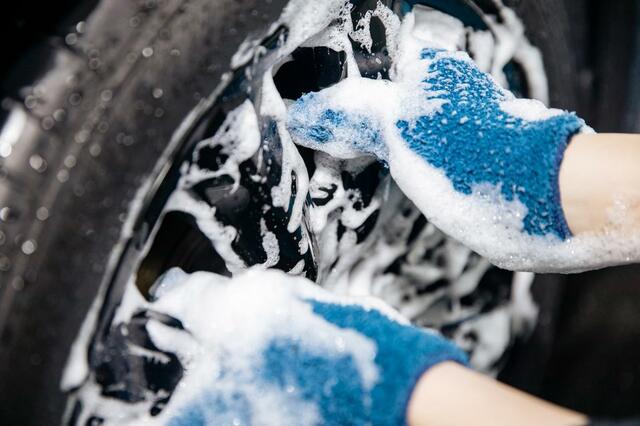 らくピカのマイクロファイバー手袋を装着し、ホイールから順番に洗っていきます。
