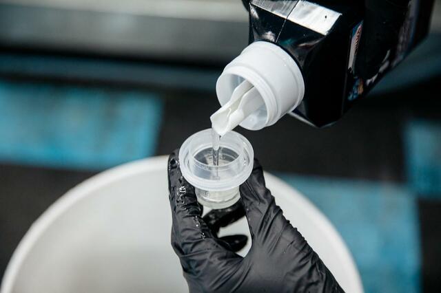 バケツにシャンプーの原液を入れたら、勢いよく水を注いでいきます!