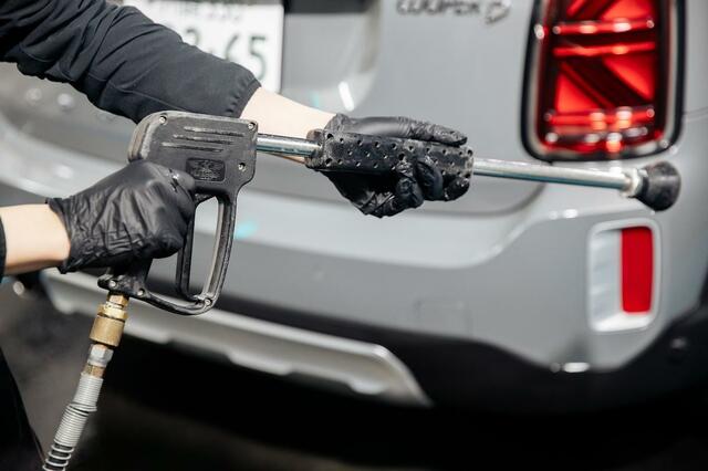 至近距離で強い水を当ててしまうと車体が傷ついてしまう恐れがあるので、近づきすぎない距離感で汚れを流してあげましょう。