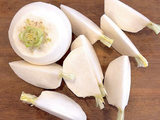 1. かぶは葉のつけ根を1.5cmほど残して皮をむき,くし形に切る。