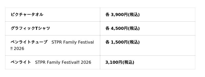 また、オフィシャルグッズが2026年2月22日(日)17:00より、STPR ONLINE STOREにて【会場受取】販売を開始いたします。こちらは、事前にSTPR ONLINE STOREでご注文&お支払いを完了いただくことで、公演当日に会場にてスムーズに商品をお受け取りいただけます。なお、当日の会場販売も実施予定となっております※詳細は後日お知らせ