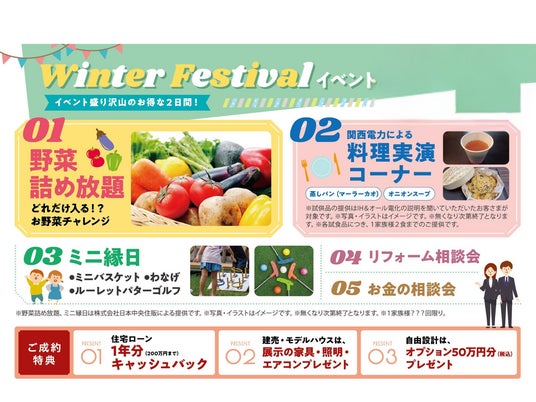 株式会社日本中央住販は、2月16日(月)から2月23日(月・祝)までの8日間、創業40年目を記念したイベント第3弾、「ハートフルビレッジ九条駅前 Winter Festival」を開催いたします。期間中は、住まいづくりを検討されている方に向けた成約キャンペーンを実施。さらに2月21日(土)・22日(日)の2日間は、新モデルハウス完成を記念した体験型イベントを開催し、家族みんなで楽しみながら住まいについて学べる機会をご提供します。