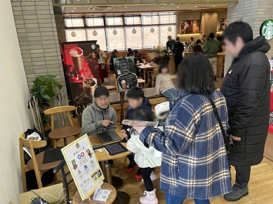 自分の描いた絵がデジタル空間に飾られた瞬間、こどもたちの目は輝き、1組あたり平均10分ほど滞在。スタバ前の人通りの中から足を止めた5組の親子(こども7名)が、メタバースという未知の空間を自分たちの表現の場として楽しみました。