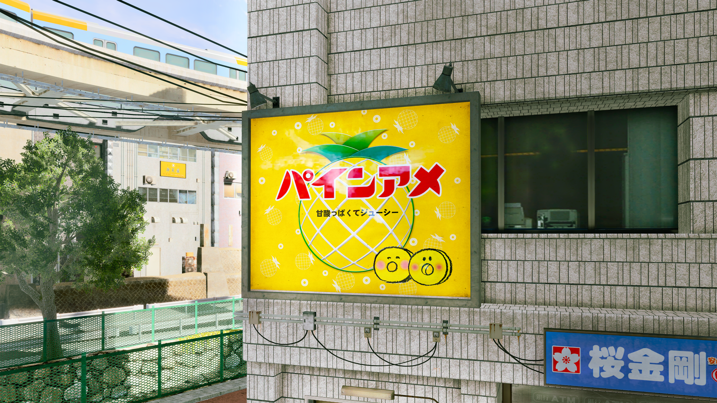 舞台となる歓楽街のひとつ「神室町」にあるコンビニエンスストアでは、ゲーム内の回復アイテムとして「たべる珈琲」のほか、「パインアメ」「あわだま」も登場。また、「パインアメ」の看板も掲示されています。