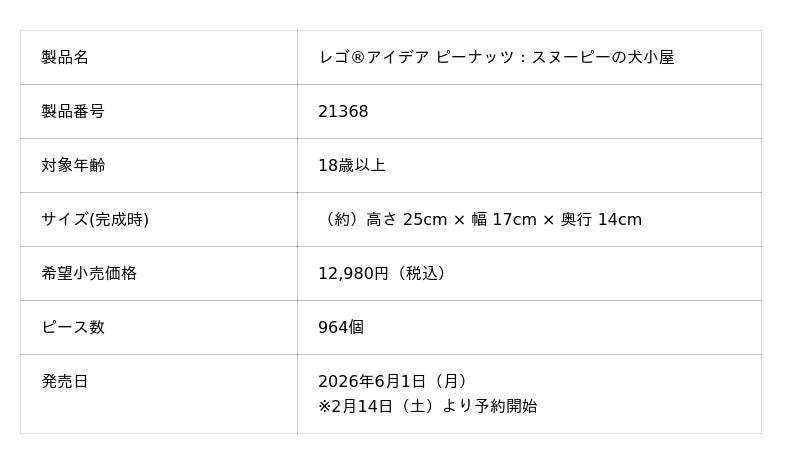 レゴジャパン株式会社(代表取締役社長:マイケル・エベスン/所在地:東京都港区、以下レゴジャパン)は、大人の『好き』や『情熱』をクリエイティブに自分で表現できる大人向けのレゴ(R)ブロックから、レゴグループとピーナッツ(Peanuts(R))の初めてのコラボレーションとなる「レゴ(R)アイデア ピーナッツ:スヌーピーの犬小屋」を2026年2月14日(土)より予約受付開始、2026年6月1日(月)より一般販売を開始します。(※一部店舗により予約販売の日時が異なります)