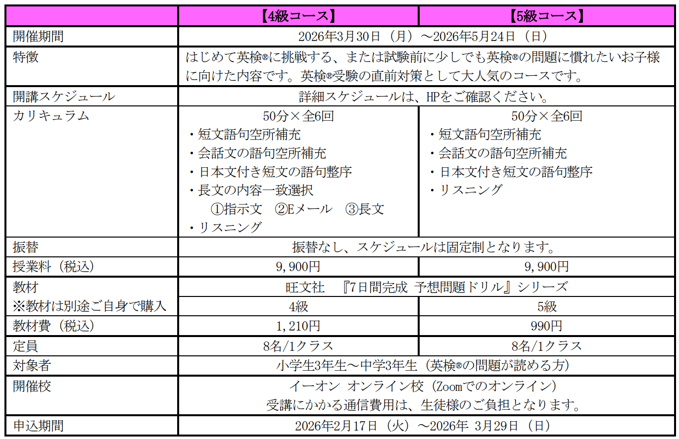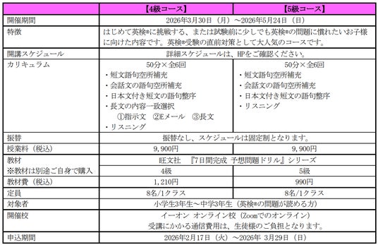 英会話教室を運営する株式会社イーオン(本社:東京都新宿区、代表取締役社長:重野卓、以下「イーオン」)は、2026年5月31日(日)に行われる英検(R)初めて挑戦するお子様に向けて、オンライン校のキッズクラスで「はじめての英検(R)4級/5級対策コース」を開講します。
