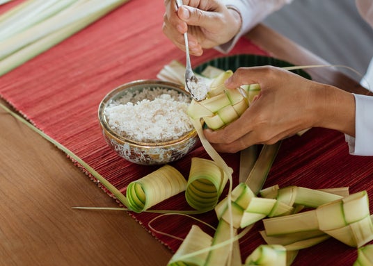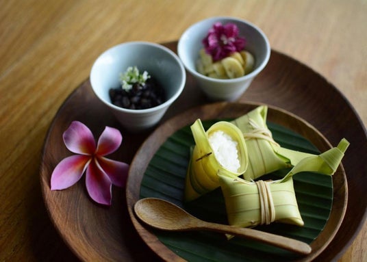 「ジャジェ・バンタル」は、すりおろしたココナッツ入りもち米の中にバナナや甘い豆を入れ、若いヤシの葉で包むバリの伝統菓子です。バリ・ヒンドゥーのお祭りのお供え物にも用います。「クトゥパット」は、塩で味付けしたもち米を、若いヤシの葉で編んだ容器に包み茹でるちまきです。この2種類を作り、さまざまな宗教の調和と隣人へ感謝を込めて食べ物を分かち合う「ンゲジョット」という考えを学び、「ソトアヤム」(スパイスが香るインドネシアのチキンスープ)とともに食します。
