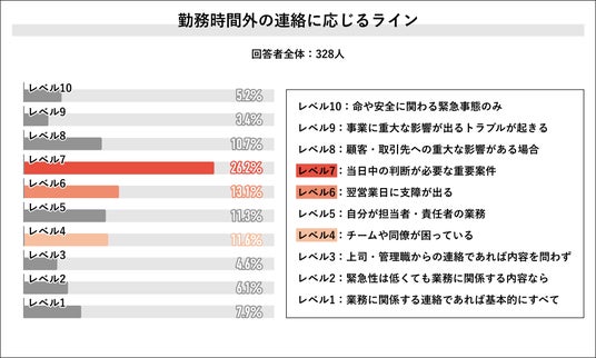 回答者全体の328人に、勤務時間外の連絡に応じるラインを聞くと、「レベル7:当日中の判断が必要な重要案件」が 26.2%で多数を占め、次いで「レベル6:翌営業日に支障が出る」が13.1%、「レベル4:チームや同僚が困っている」が11.6%となりました。