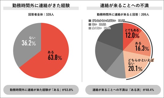 回答者全体の328人に、勤務時間外に職場の人からの連絡がきたことはあるかを聞くと、「ある派」は63.8%で過半数を占め、「ある派」は63.8%で過半数を占め、「ない派」は36.2%でした。連絡が来ると回答した209人に、連絡が来ることへの不満有無を聞くと、「ある派」は48.4%となり、内訳は「とてもある」12.0%、「ある」16.3%、「どちらかといえばある」20.1%でした。