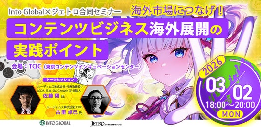 株式会社ツクリエ(本社:東京都千代田区 代表取締役:鈴木英樹 以下、ツクリエ)が東京都から運営受託する「Into Global~令和7年度東京都コンテンツ産業海外展開課題解決プログラム~(以下、Into Global)」は 「コンテンツビジネス海外展開の実践ポイント」と題したセミナーをジェトロと共催で3月2日(月)に開催いたします。