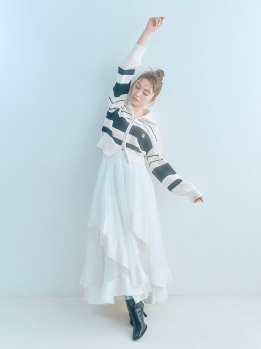 CARDIGAN ¥13,200/ CAMISOLE ¥4,950/ SKIRT ¥12,100