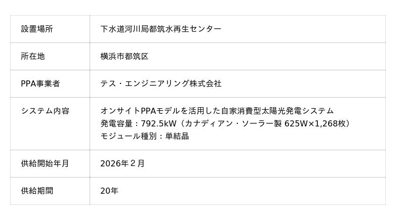テスホールディングス株式会社(本社:大阪市淀川区、代表取締役社長:山本 一樹、以下「当社」)は、連結子会社であるテス・エンジニアリング株式会社(本社:大阪市淀川区、代表取締役社長:高崎 敏宏、以下「テス・エンジニアリング」)が、神奈川県横浜市(市長:山中 竹春、以下「横浜市」)の下水道河川局都筑水再生センター(以下「都筑水再生センター」)向けに、オンサイトPPAモデル※1を活用した自家消費型太陽光発電システムによる再生可能エネルギー電気の供給(以下「本事業」)を2026年2月から開始いたしましたのでお知らせいたします。
