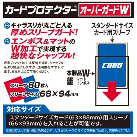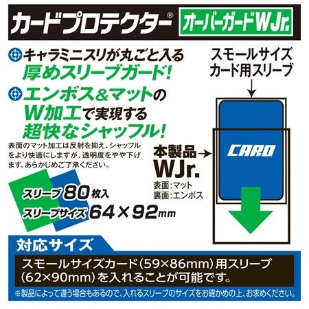 「カードプロテクターオーバーガードWJr.」はスモールサイズカード(59×86mm)のスリーブ(62×90mm)に対応しており、2重に使うことでカードをよりしっかりと保護することができます。