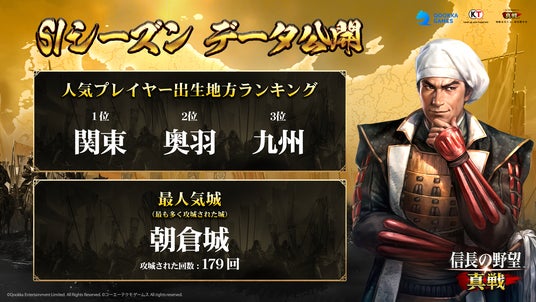 - 人気プレイヤーの出生地方トップ3/一番人気の城: 朝倉城、攻城された回数:179回
