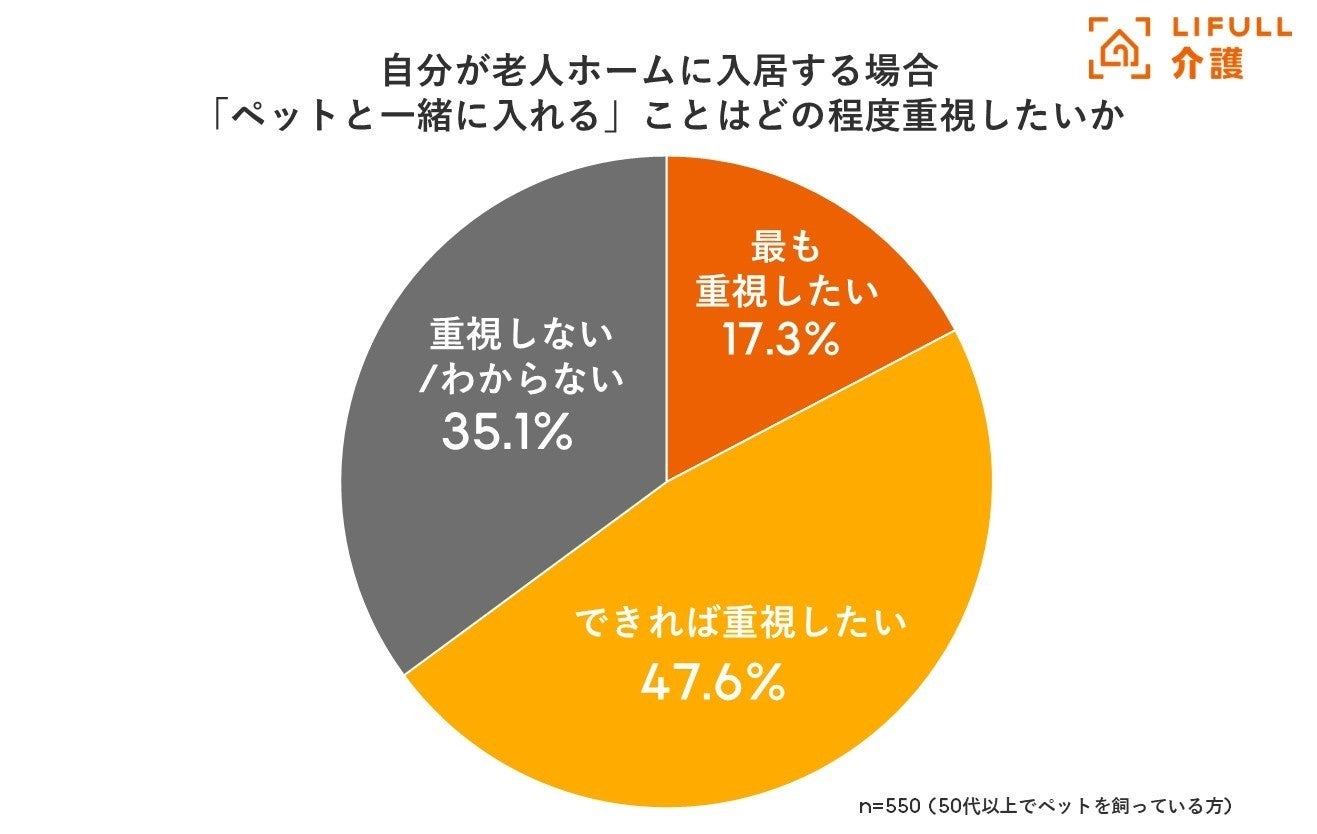 ご自身が入居する老人ホームを選ぶにあたって、「ペットと入れる」ことをどの程度重視したいかを尋ねたところ、「最も重視したい」が17.3%、「できれば重視したい」が47.6%と、合わせて6割以上の人が重視したいと考えていることが明らかになりました。