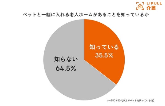 ペットと入れる老人ホームがあることについて、「知っている」が35.5%、「知らない」が64.5%と、ペットを飼っている人でもその認知率は4割未満であることが明らかになりました。