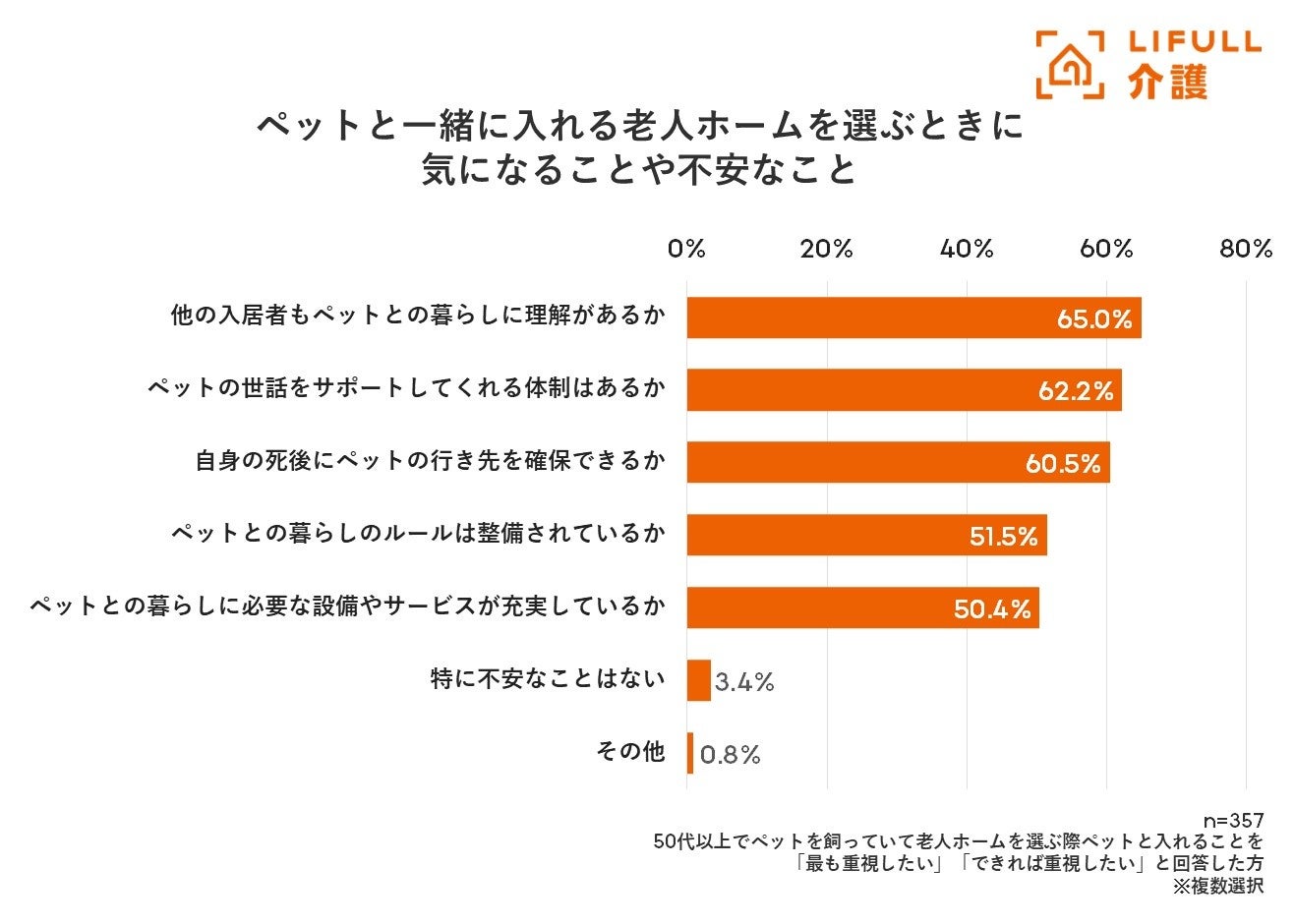 ペットと入れることを老人ホーム選びで「最も重視したい」「できれば重視したい」という方に、入居する上での不安や気になる点について聞いたところ、最も多かったのは「他の入居者もペットとの暮らしに理解があるか」(65.0%)となりました。