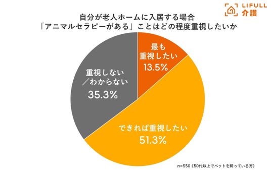 自分が入居する老人ホームを選ぶにあたって「アニマルセラピーがある」ことを「最も重視したい」が13.5%、「できれば重視したい」が51.3%と、あわせて6割以上が老人ホーム探しの条件として重視したいと考えていることが分かりました。