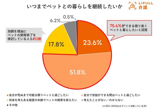 ペットといつまで暮らしたいかを尋ねたところ「自分が死ぬまで可能な限りペットと過ごしたい」は23.6%、「自分で世話ができる間はペットと過ごしたい」は51.8%と、合わせて75.4%が可能な限りペットと長く暮らしたいと考えていることが分かりました。一方で、「将来を考えある程度の年齢でペットの飼育を終えたい」も17.8%と約2割を占める結果となりました。