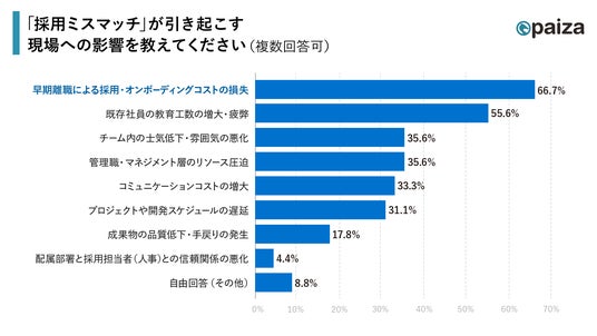 今回の調査では、回答企業の7割以上で採用ミスマッチが発生しており、 特に中途採用の現場において発生頻度が高いことがわかりました。採用ミスマッチが引き起こす現場への影響として「早期離職による採用・オンボーディングコストの損失」が大きいと考える採用担当者が多く、実に66.7%にものぼりました。人材紹介会社に支払う採用フィーはプランや候補者の年収にもよりますが、人材不足の昨今高騰傾向にあることから採用担当者がコストを気にする傾向が強く出たと推測されます。