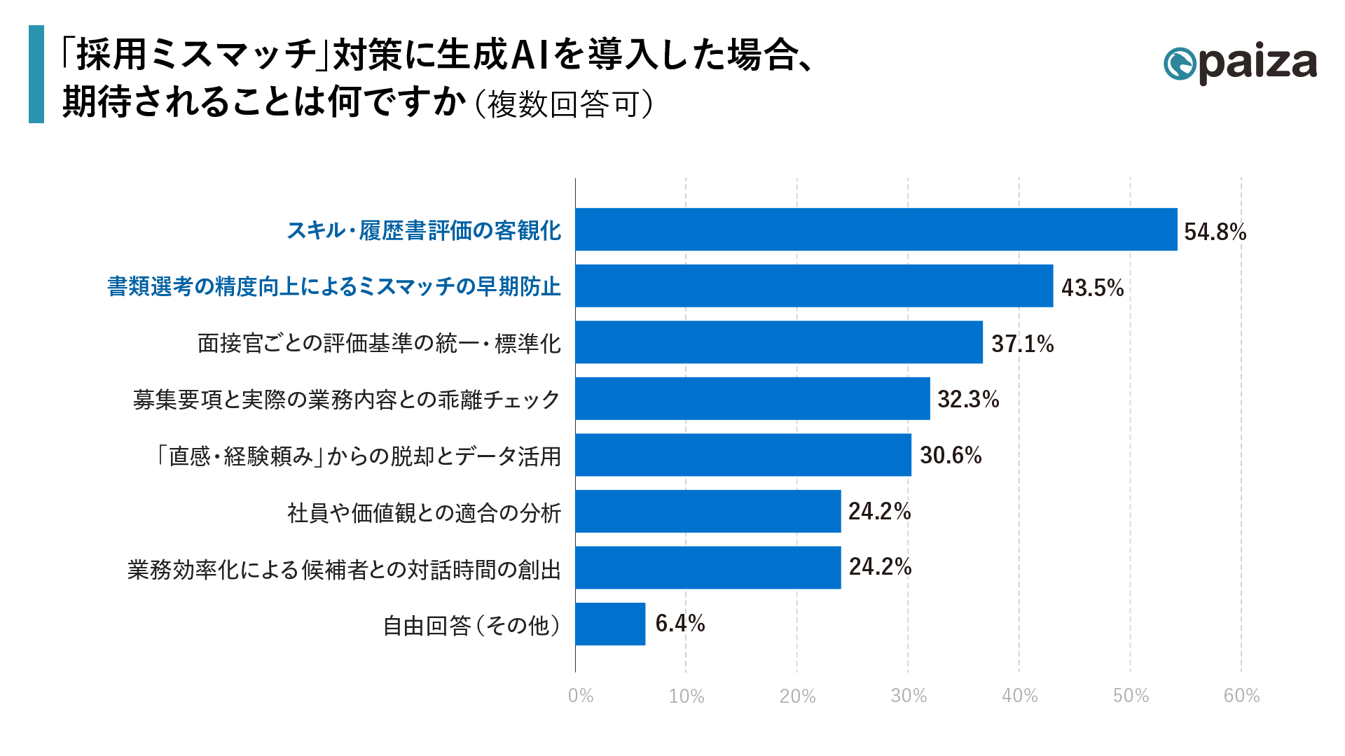 採用ミスマッチ対策として生成AIを導入した場合、採用担当者が期待することとしては「スキル・履歴書評価の客観化」が54.8%と過半数、次いで「書類選考の精度向上によるミスマッチの早期防止」43.5%という結果になりました。