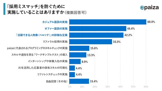 採用ミスマッチを防ぐために実施していることは「カジュアル面談」が1位で60.0%となりました。次いで「オファー面談」が44.4%、「ペルソナ定義」が42.2%となっています。