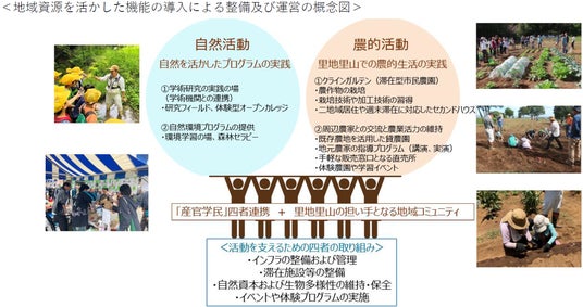 農園利用者と農業従事者、地域住民、地元学生等が連携した農業指導イベントやレクリエーションの開催、里山の自然を活用した体験プログラムやモニタリングの実践などを通じて、農業体験や自然環境保護に対する関心を高め重要性の理解を深めるほか、参加者と地域住民の交流促進および地域への愛着形成につなげます。