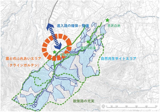 本計画は、「湘南平塚ゆるぎ 里地里山」内の自然共生サイト*2を中心とする「自然環境の維持・保全」と、クラインガルテン(滞在型市民農園)を中核とする地域活性化を促進し、両立させる計画です。