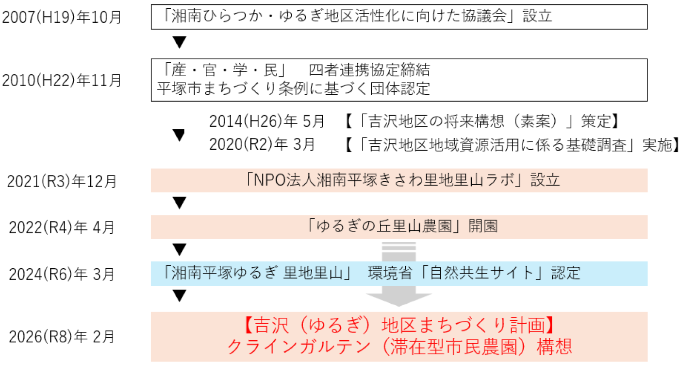 協議会は2007年に設立後、2010年に「産・官・学・民」四者連携協定の締結および平塚市まちづくり条例に基づく団体として認定を受けました。その後、2014年に策定した「吉沢地区の将来構想」の具体化に向けて、協議会の関連団体として2021年にNPO法人湘南平塚きさわ里地里山ラボ(以下「NPO法人」)が設立されました。NPO法人は2022年4月に農作業学習農園「ゆるぎの丘里山農園」を開園し、一年を通して農作業体験講習会などを開催するなど、本計画の2軸のひとつである農的活動を主導しています。「ゆるぎの丘里山農園」では、近年、市外や県外からの受講生が増加し、NPO法人の活動実績を積み上げてきました。 本計画は、NPO法人のこれまでの活動実績と地域活性化に対する機運の高まり、また本計画区域の一部が2024年3月に自然共生サイトに認定されたことを契機に、実現化に向けて推進しているものです。