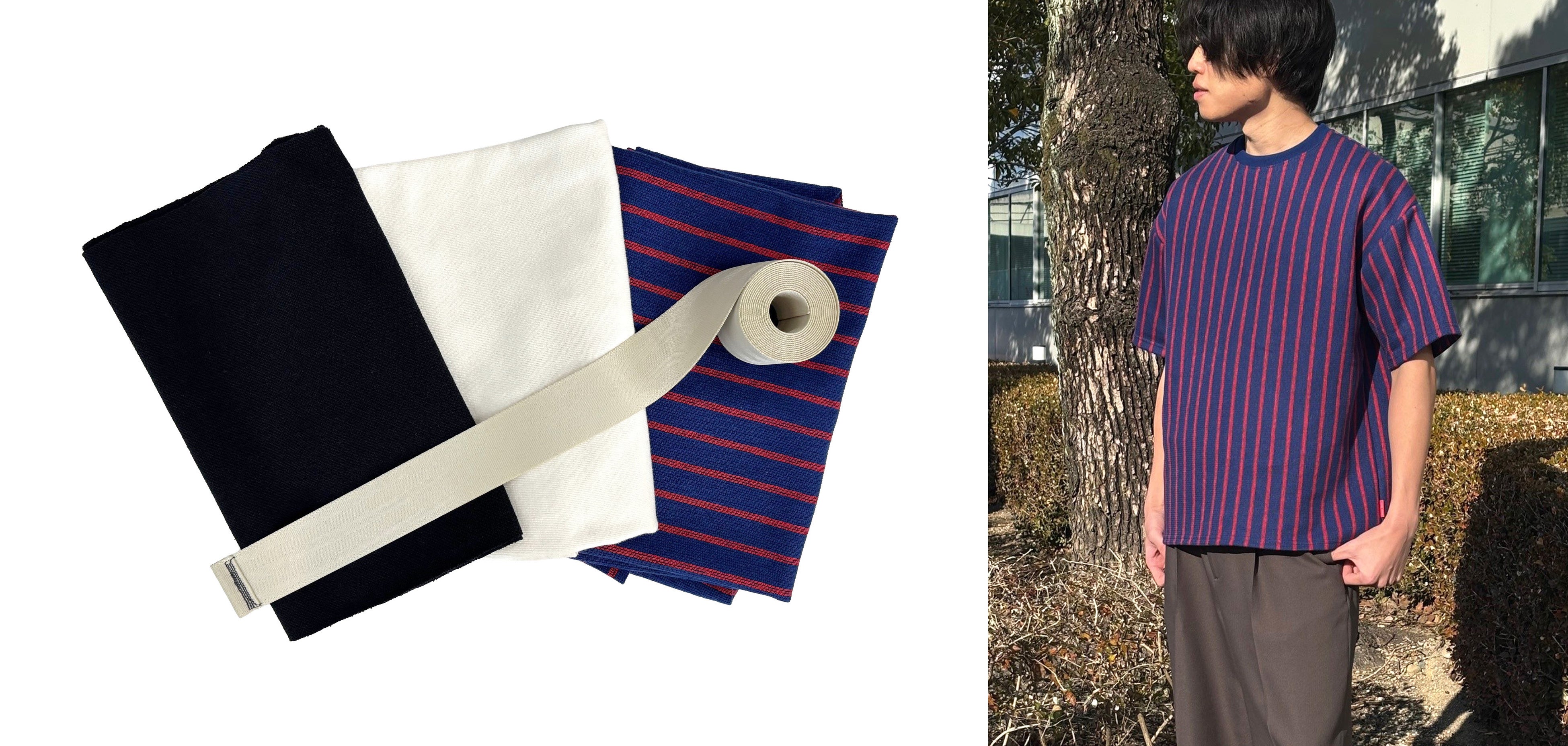 左写真:「尾州編 再生シートベルト生地」の試作サンプル 右写真:試作生地によるTシャツ