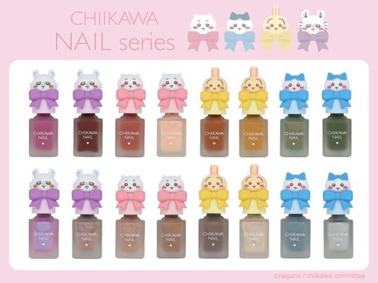 新商品は「ちいかわ」のかわいいネイルシリーズ。ちいかわ、ハチワレ、うさぎ、モモンガの全4キャラクターのキャップがついたデザインで、それぞれ異なる色のリボンがあしらわれています。キャップは取り外し可能なため、好きなキャラクターと好きなネイルカラーを組み合わせて、自分好みにカスタマイズが可能。ネイルカラーは全16色とバリエーション豊富で、ラメや偏光パール入りの華やかなカラーから、使いやすいシンプルなカラーまで幅広く展開。高発色ながらムラになりにくく、キレイなツヤ感のある仕上がりに。見た目のかわいさだけでなく、実用性も兼ね備えたネイルカラーです。並べて飾ってもかわいく、思わず全色集めたくなるアイテムです。
