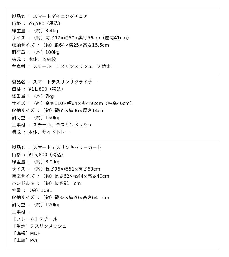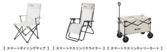 「スマートダイニングチェア」「スマートテスリンリクライナー」「スマートテスリンキャリーカート」は、ロゴスショップをはじめ有名スポーツチェーン店・ホームセンターなど全国で発売しております。