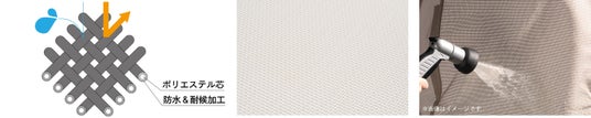 テスリンメッシュ素材は、ポリエステル糸にコーティングを施しているため、耐水性と耐候性に加えて通気性も高い。汗をかいたままでも蒸れにくく、濡れた水着のままでも快適にくつろげるため、海や川など水辺のレジャーにも最適。濡れたギアや汚れた荷物を気兼ねなく載せることができ、汚れても水でさっと洗い流せてお手入れもラクラク。