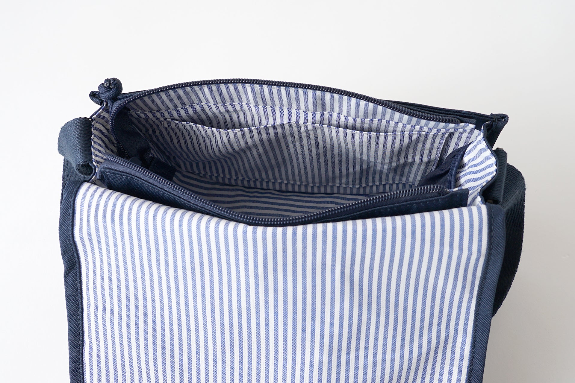 バッグ内部には、仕分けに便利なファスナーポケットとオープンポケットを完備。小物が迷子にならず、快適に整理が行えます。 さらに、内生地には爽やかなブルーのストライプ柄を採用。心が弾む可愛らしさだけでなく、中を明るく照らすことで、奥にある荷物が見つけやすいという実用性も備えています。