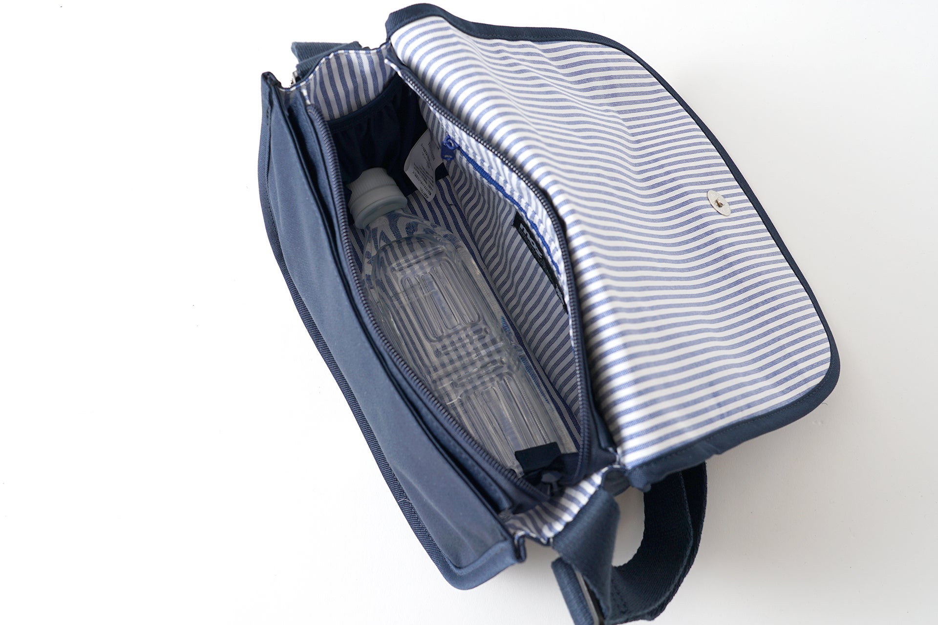 A5サイズが収まる絶妙な設計で、500mlペットボトルも横向きにすっぽり。必要なものをスマートに持ち運べる、お出かけの強い味方です。