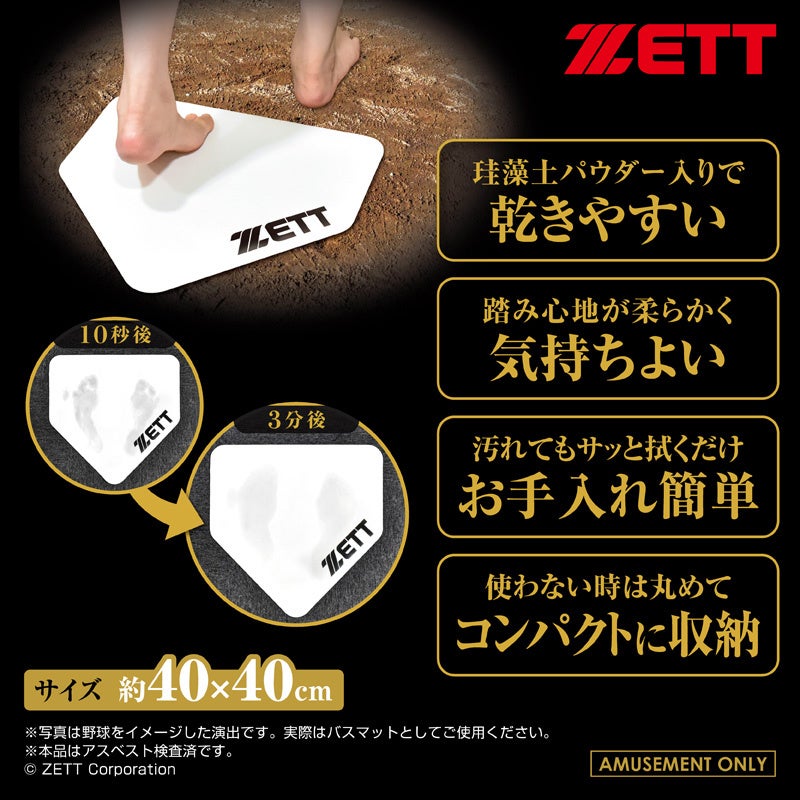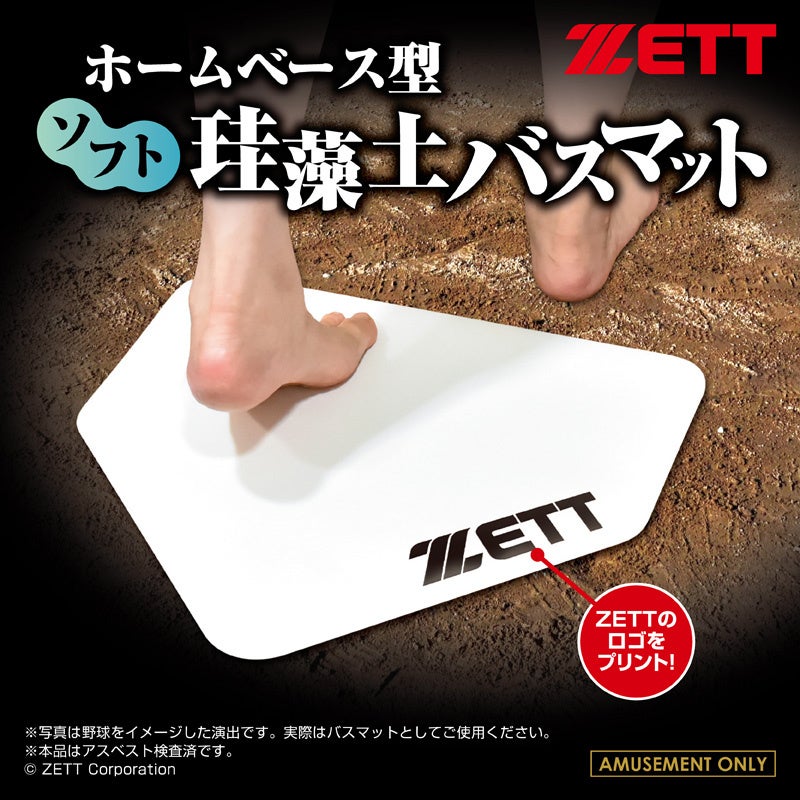 ホームベースそっくりの五角形の白いバスマットにZETTのロゴを印字!珪藻土パウダー配合で乾きやすく、柔らかい踏み心地で、使わないときはくるっと丸めてコンパクトに収納できます!