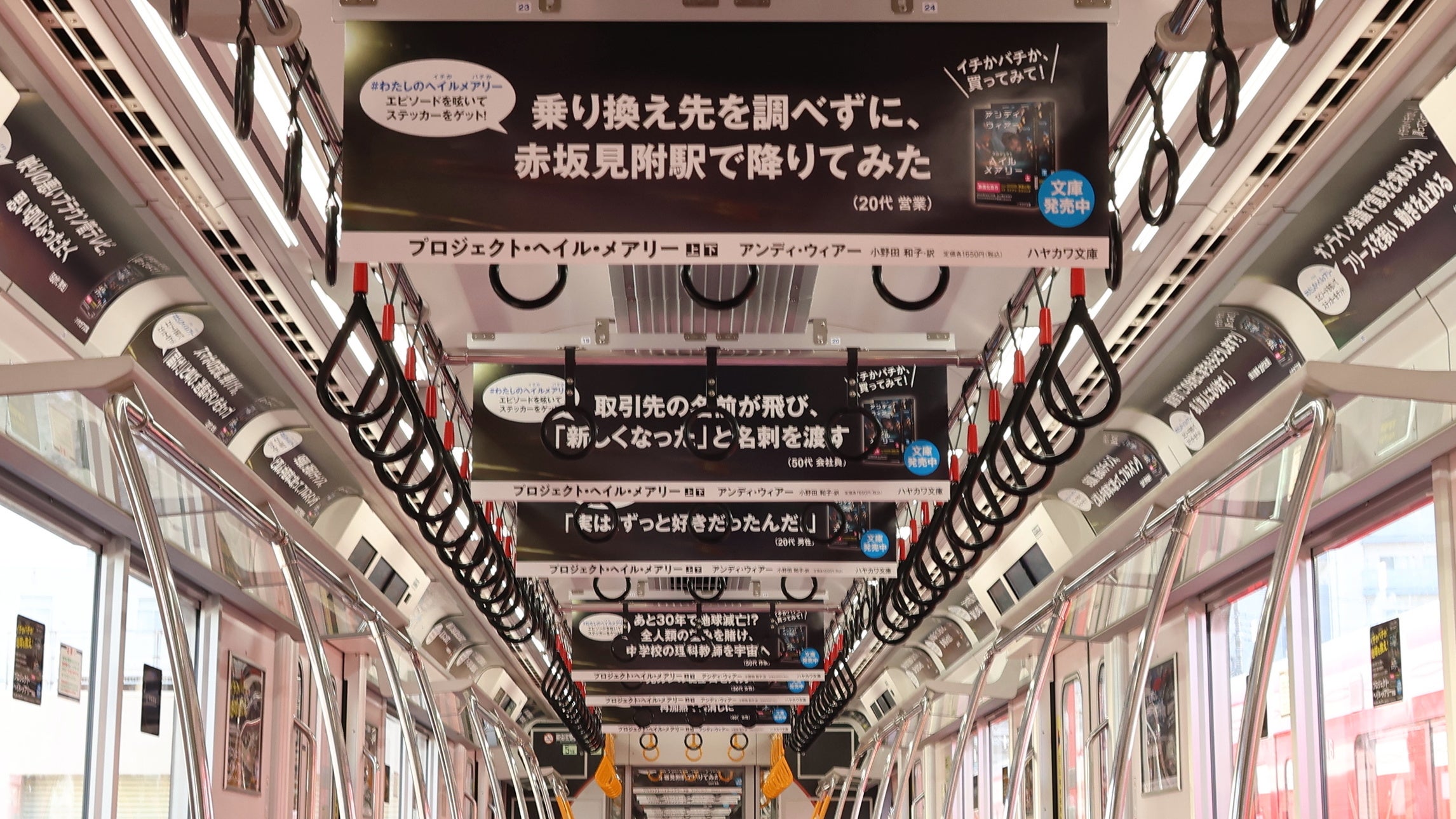 1編成全車両の中づりやまど上ポスターに、本作タイトルにちなんだ、日常の様々な「ヘイル・メアリー(イチかバチか)エピソード」を掲載。身近なヘイル・メアリー(イチかバチか)エピソードを通じて、『プロジェクト・ヘイル・メアリー』の魅力をお伝えします。
