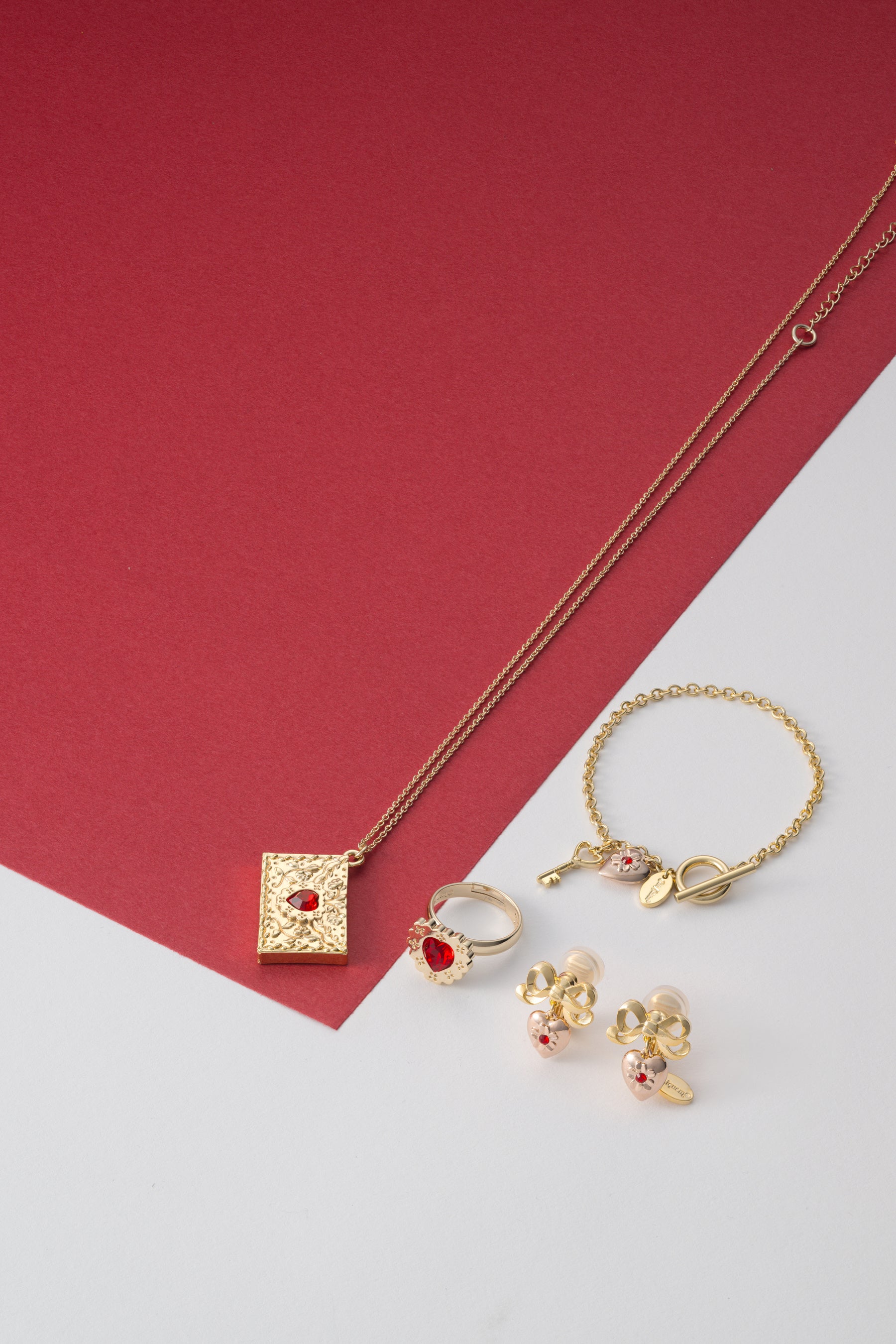 「身に着けるだけで気分が上がるアクセサリー」を提案するアクセサリーブランドLiquem(リキュエム)とのコレボレーションアイテムは、ラブレターやハートをモチーフにした5つのアイテムを展開。赤いライトシャムのハートクリスタルとゴールドカラーが上品にお顔や手元を彩ります。
