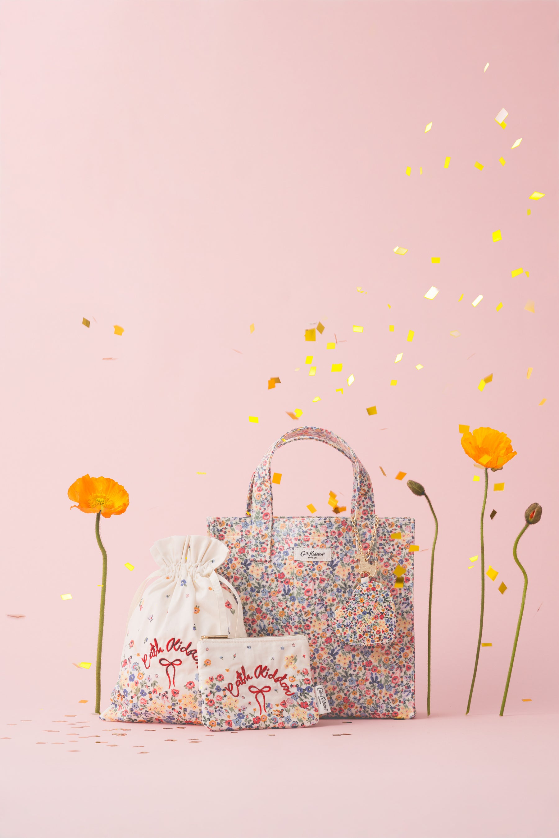 Cath Kidston再上陸後の1号店でフラッグシップストアである表参道店の、オープン1周年を記念したシリーズは、小花にリボンが散りばめられたアート、Harmony Ditsyで3種のアイテムをご用意。華やかで多幸感のある、Cath Kidstonらしさ溢れるアートを、Cath Kidstonの代名詞でもあるコットンにPVCコーティングを施したファブリックで作られた、500mlのペットボトルがすっぽり隠れる日本限定サイズのスモールコーティングバッグと、再上陸後から日本限定商品として人気が高いコットン素材のティッシュポーチ、ドローストリングポーチを展開いたします。周年記念にふさわしい、お花が舞い上がるような、華やかで特別なデザインです。