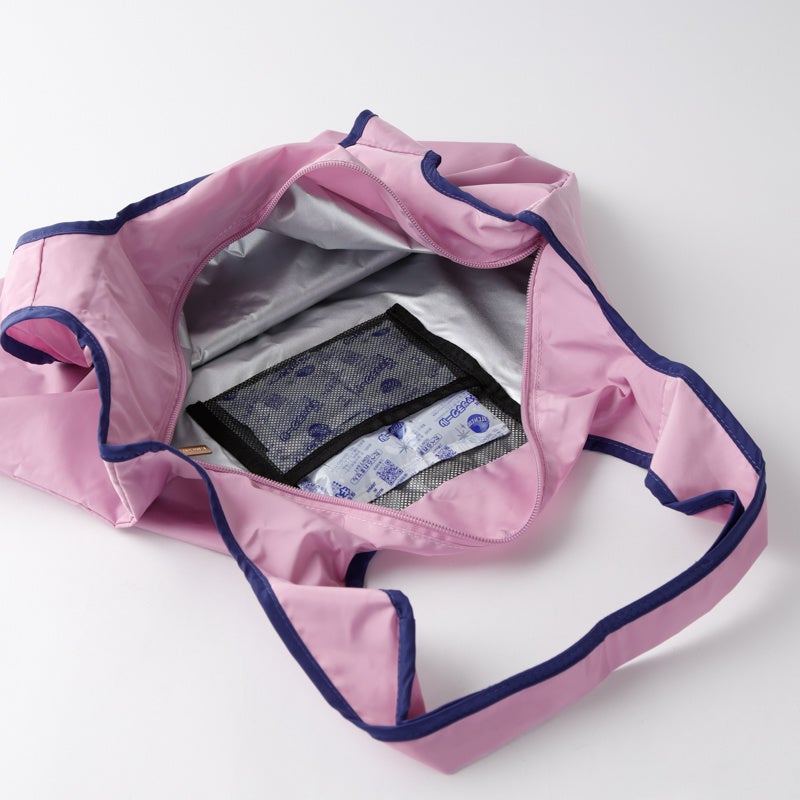 使いやすさの秘密は、シンプルな構造上部のファスナーを閉じれば、中身が飛び出す心配なく安心して持ち運べます。バッグの内側にはメッシュポケットを装備しており、保冷剤やポイントカード、小物の収納にも便利です。シンプルながら、毎日の使い勝手をしっかり考えた機能的なデザインとなっています。