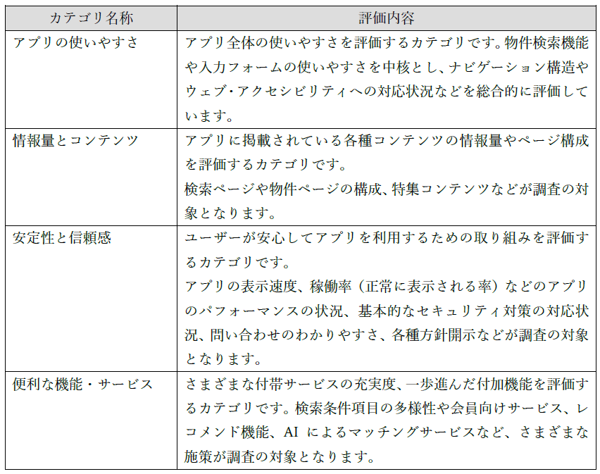 本調査では、スマートフォンアプリの利便性をさまざまな角度から分析・評価するために、以下の4つのカテゴリからなるランキング・スコアカードを用います。各カテゴリの主な評価内容は以下のとおりです。