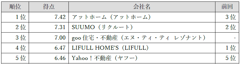 「Gomez売買不動産情報アプリランキング」の結果は、以下のとおりです。