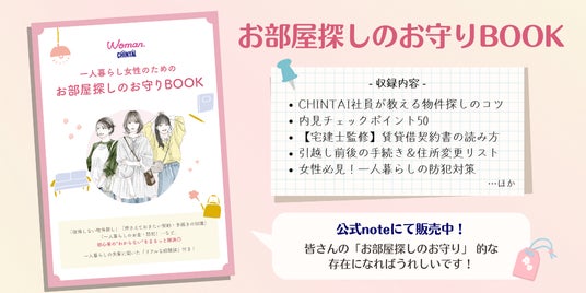 『Woman.CHINTAI』は、一人暮らし女性向けの賃貸物件検索サイトです。『Woman.CHINTAI』では、女性の一人暮らしを、お部屋探しの場面だけではなく、住んでからの不安にも寄り添いながらサポートしています。Woman.CHINTAI:https://woman.chintai/