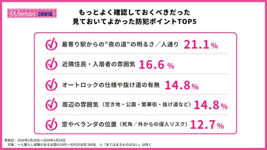 一人暮らしの際に「もっと確認すべきだった点」「見ておいてよかった」と思う防犯ポイントについて尋ねたところ、「最寄り駅からの“夜の道”の明るさ/人通り」(21.1%)が最も多く挙げられました。次いで「近隣住民・入居者の雰囲気」(16.6%)や「オートロックの仕様や抜け道の有無」(14.8%)などが続き、物件設備だけでなく周辺環境や建物の状況を事前に確認する重要性がうかがえます。