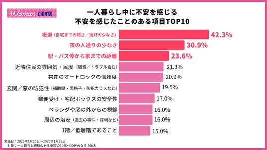 お部屋探しのリーディングカンパニー株式会社CHINTAI(本社:東京都港区 代表取締役社長 奥田倫也、以下CHINTAI)の運営する女性向け賃貸物件検索サイト『Woman.CHINTAI』は、一人暮らし経験のある10代~30代の女性を対象に、お部屋探しや日常生活における「防犯意識」に関するアンケート調査を実施いたしました。