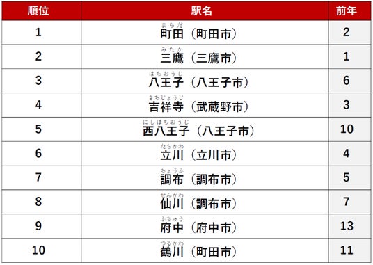 2位に「八王子」駅、3位に「三鷹」駅がランクインしました。