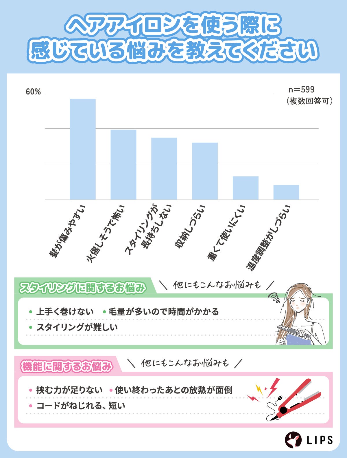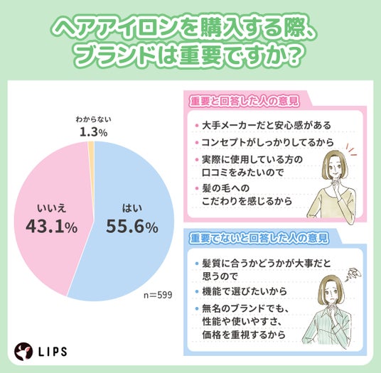 株式会社AppBrew(本社所在地:東京都文京区、代表取締役:松田崇)が運営する美容プラットフォーム「LIPS(リップス)」は、「ヘアアイロン」についてLIPSユーザー599名を対象に、アンケート調査を実施しました。今回の調査では、ヘアアイロンを選ぶ上での重視点から情報収集の方法まで、ユーザーの具体的な行動や価値観を調査しました。