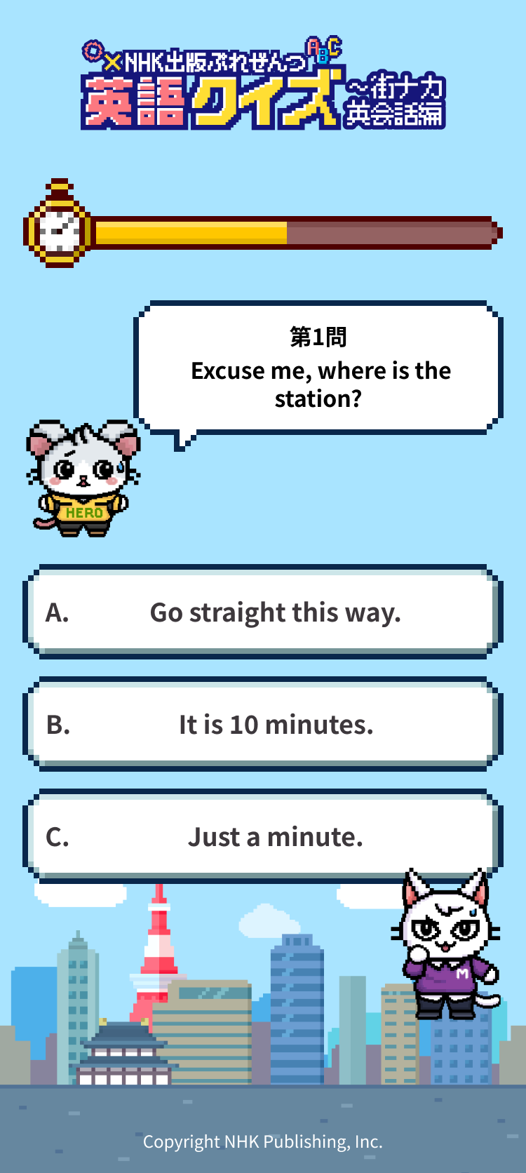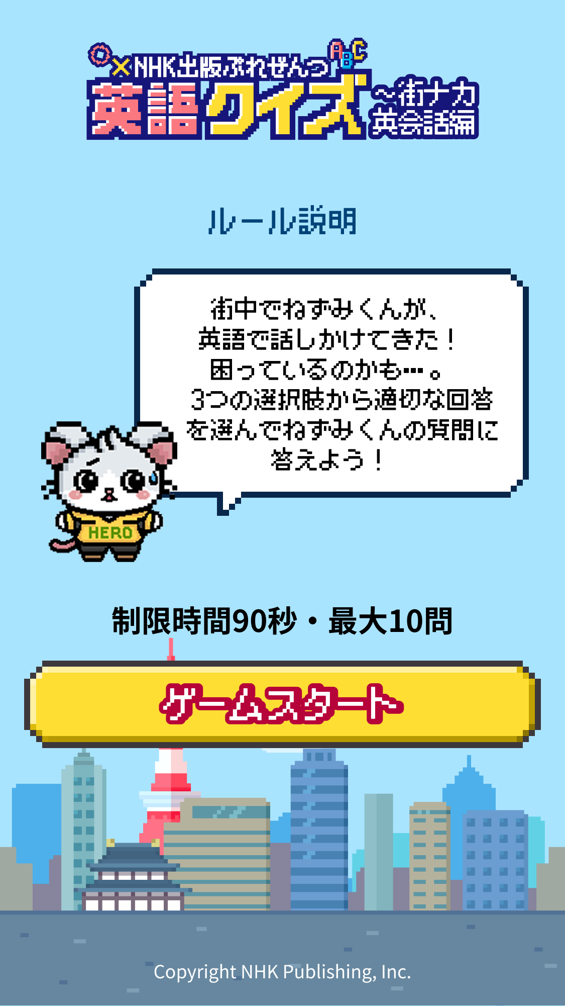 2026年度の「英語クイズ~街ナカ英会話編」は、そのパラレルワールド。街中で困っている様子の、観光客らしき格好をしたねずみくんを、ねこが助けてあげるというストーリーです。